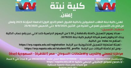 تهنئ كلية نبتة الطلاب المقبولين بالكلية القبول العام (الدور الاول) الدفعة المؤجلة 2023وتعلن عن فتح باب التسجيل لهم في الفترة من الاثنين 8/9/2025 حتي الخميس 25/9/2925 متطلبات التسجيل: – سداد رسوم التسجيل كاملة بالاضافة ل 50 % من الرسوم الدراسية كحد ادني عبر رقم حساب الكلية ببنك الخرطوم باسم شركة الرقيم كلية نبتة 3379235 – استلام index no من الكلية – تعبئة استمارة التسجيل الالكترونية عبر الرابط – https://erp.napata.edu.sd/registration –… اقرأ المزيد »فتح باب التسجيل للطلاب المقبولين بالكلية